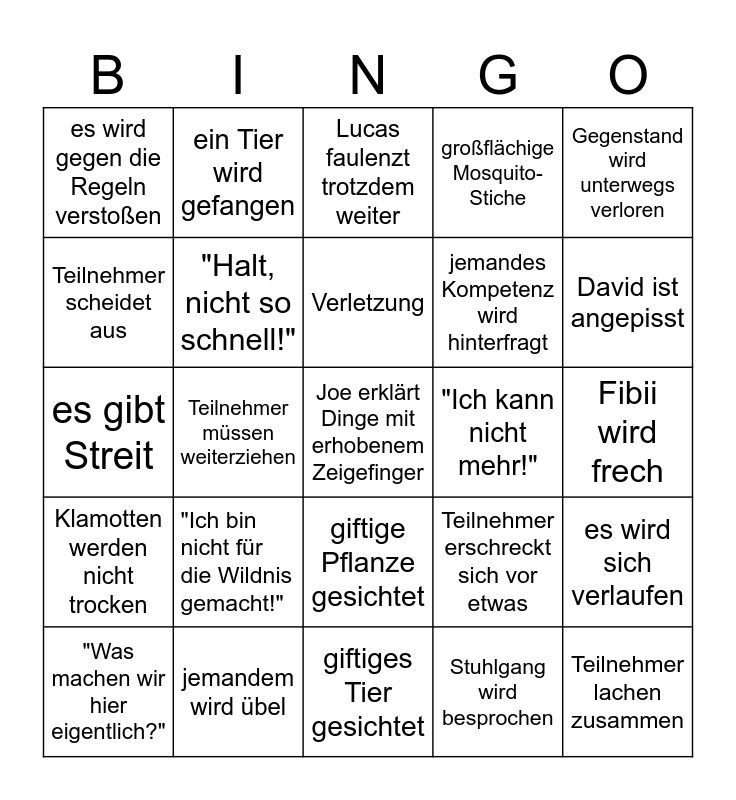 This bingo card has 25 words: "Ich bin nicht für die Wildnis gemacht!", giftiges Tier gesichtet, Verletzung, "Was machen wir hier eigentlich?", Gegenstand wird unterwegs verloren, es wird gegen die Regeln verstoßen, Teilnehmer scheidet aus, ein Tier wird gefangen, "Ich kann nicht mehr!", giftige Pflanze gesichtet, jemandes Kompetenz wird hinterfragt, es gibt Streit, Teilnehmer erschreckt sich vor etwas, es wird sich verlaufen, "Halt, nicht so schnell!", Teilnehmer lachen zusammen, Fibii wird frech, Lucas faulenzt trotzdem weiter, David ist angepisst, Teilnehmer müssen weiterziehen, Joe erklärt Dinge mit erhobenem Zeigefinger, jemandem wird übel, Klamotten werden nicht trocken, großflächige Mosquito-Stiche and Stuhlgang wird besprochen.