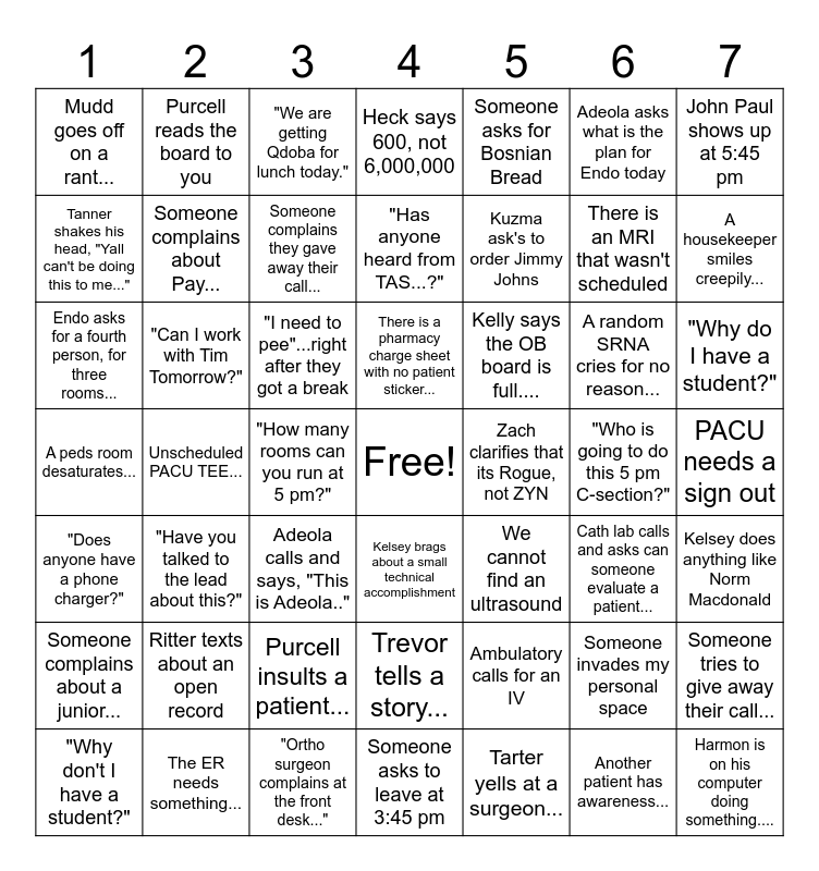 This bingo card has a free space and 48 words: Ambulatory calls for an IV, There is an MRI that wasn't scheduled, Someone asks to leave at 3:45 pm, Unscheduled PACU TEE..., "I need to pee"...right after they got a break, PACU needs a sign out, Purcell reads the board to you, The ER needs something..., Adeola asks what is the plan for Endo today, Kelsey brags about a small technical accomplishment, John Paul shows up at 5:45 pm, Heck says 600, not 6,000,000, A random SRNA cries for no reason..., Kelly says the OB board is full...., Someone complains about a junior..., "Who is going to do this 5 pm C-section?", Tanner shakes his head, "Yall can't be doing this to me...", A housekeeper smiles creepily..., Someone invades my personal space, Someone asks for Bosnian Bread, Kuzma ask's to order Jimmy Johns, "How many rooms can you run at 5 pm?", Mudd goes off on a rant..., Someone complains about Pay..., Someone tries to give away their call..., Someone complains they gave away their call..., "Why do I have a student?", "Why don't I have a student?", There is a pharmacy charge sheet with no patient sticker..., "Can I work with Tim Tomorrow?", Another patient has awareness..., Zach clarifies that its Rogue, not ZYN, Kelsey does anything like Norm Macdonald, Ritter texts about an open record, A peds room desaturates..., We cannot find an ultrasound, Cath lab calls and asks can someone evaluate a patient..., Endo asks for a fourth person, for three rooms..., Adeola calls and says, "This is Adeola..", Purcell insults a patient..., "Does anyone have a phone charger?", Harmon is on his computer doing something...., "We are getting Qdoba for lunch today.", "Ortho surgeon complains at the front desk...", "Has anyone heard from TAS...?", Trevor tells a story..., "Have you talked to the lead about this?" and Tarter yells at a surgeon....