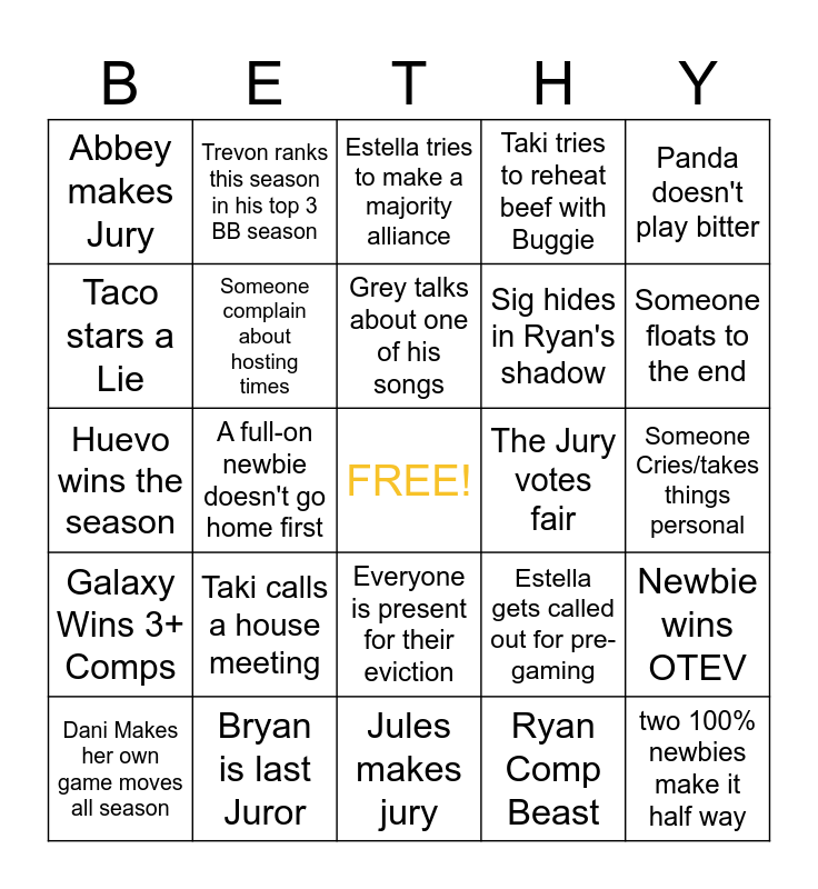 This bingo card has a free space and 24 words: Taki calls a house meeting, Bryan is last Juror, Grey talks about one of his songs, Dani Makes her own game moves all season, Panda doesn't play bitter, Abbey makes Jury, Taco stars a Lie, Trevon ranks this season in his top 3 BB season, The Jury votes fair, Everyone is present for their eviction, Sig hides in Ryan's shadow, Huevo wins the season, Estella gets called out for pre-gaming, Newbie wins OTEV, Someone complain about hosting times, Ryan Comp Beast, Someone Cries/takes things personal, Estella tries to make a majority alliance, Someone floats to the end, A full-on newbie doesn't go home first, two 100% newbies make it half way, Galaxy Wins 3+ Comps, Taki tries to reheat beef with Buggie and Jules makes jury.