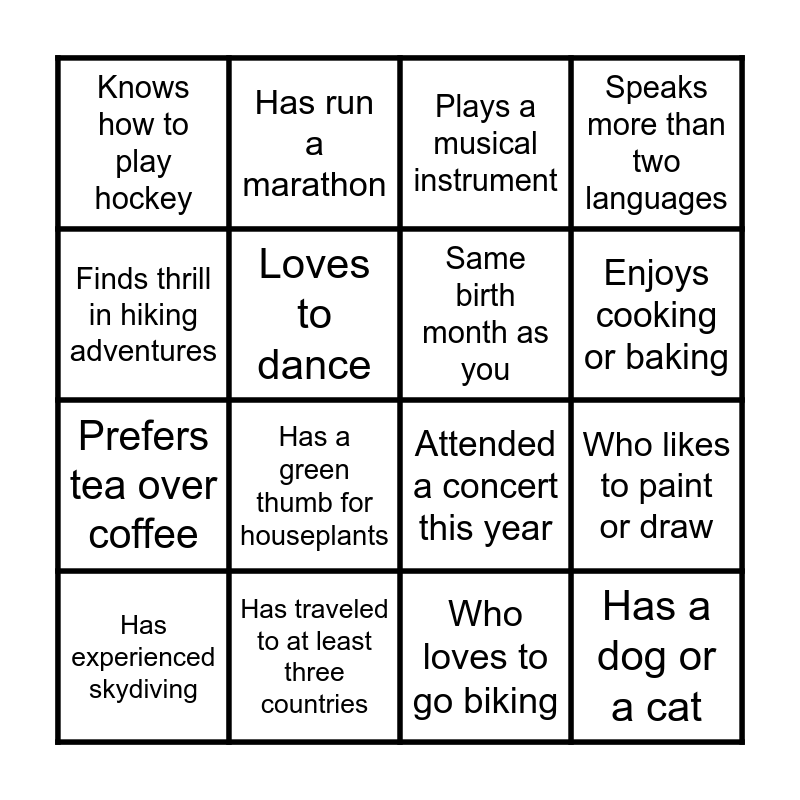 This bingo card has 18 words: Finds thrill in hiking adventures, Has traveled to at least three countries, Plays a musical instrument, Speaks more than two languages, Prefers tea over coffee, Has run a marathon, Attended a concert this year, Enjoys cooking or baking, Knows how to play hockey, Has a green thumb for houseplants, Who loves to go biking, Who likes to paint or draw, Has experienced skydiving, Loves to dance, Same birth month as you, Has a dog or a cat, Who enjoys cooking or baking and Attended a concert this year.