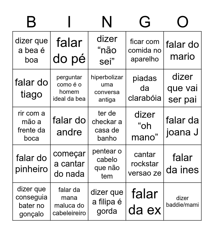 This bingo card has 32 words: falar da ex, falar das entradas, falar do andre, falar do pedro, falar do pinheiro, perguntar como é o homem ideal da bea, falar do mario, falar da ines, falar do pé, dizer baddie/mami, hiperbolizar uma conversa antiga, dizer “não sei”, o mundo não é 👐🏻, o mundo é 🤲🏻, falar dos ex da bea aka eu, dizer “oh mano”, dizer que não tem dinheiro, dizer que conseguia bater no gonçalo, rir com a mão a frente da boca, pentear o cabelo que não tem, começar a cantar do nada, cantar rockstar versao ze, falar de gajas em geral, falar da joana J, falar da mana maluca do cabeleireiro, ter de checkar a casa de banho, ficar com comida no aparelho, piadas da clarabóia, falar do tiago, dizer que a bea é boa, dizer que a filipa é gorda, fazer se a ex do pedro and dizer que vai ser pai.