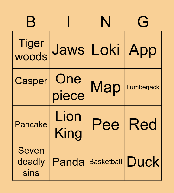 This bingo card has 16 words: Panda, Red, Loki, Tiger woods, Pancake, Jaws, Pee, Basketball, Casper, One piece, Seven deadly sins, App, Lion King, Lumberjack, Map and Duck.