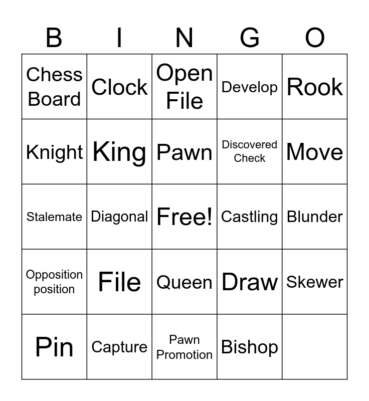 This bingo card has a free space and 33 words: Check, Checkmate, Pawn, Bishop, Rook, Knight, King, Queen, Discovered Check, Blunder, Stalemate, Clock, Draw, Skewer, Opposition position, File, Scoring Sheet, Castling, Move, Fork, Capture, En passant, Develop, Pin, Opponent, Pawn Promotion, Chess Board, Diagonal, Open File, Rating, Queen Sacrifice, Illegal Move and Attack.