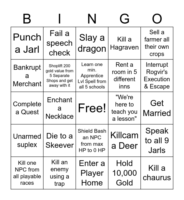 This bingo card has a free space and 78 words: Kill a child, Fend off 3 contracted attempts on your life, Slay a dragon, Murder an NPC in their home & wreck the place, Kill a Daedra, Paralyze a Civilian, Obtain a Dragon Claw, Obtain 5 Words of Power, Meet a Ghost, Become Thane, Clear a Dungeon with no Weapons or Magic, Donate to all 11 Beggars, Kill a Hagraven, Punch a Jarl, Steal A Dibella Statue, Bankrupt a Merchant, Break out of Jail, Die to a Skeever, Obtain 3 Flawless Gems, Get Married, Deliver Kharjo's moon amulet, Sell a farmer all their own crops, Complete a Quest, Learn one min. Apprentice Lvl Spell from all 5 schools, Shoplift 200 gold value from 5 Separate Shops and get away with it, Kill any npc by reverse pickpocketing poison, Sell Skooma, Contract all 9 contractible diseases, Kill a Giant and take it's toe, Clear a Dungeon without healing, Interrupt Rogvir's Execution & Escape, Visit all 9 Hold Capitals, Enter a Player Home, Cast a master level spell, Kill one NPC from all playable races, "We're here to teach you a lesson", Acquire any piece of a joinable guild's armor, Pickpocket an Enchanted Ring, Obtain a dragon priest's mask, Kill a chaurus, Eat 10 stolen sweet rolls, Learn 5 new Spells, Deliver 20 cases of alcohol to an inn, Read 5 Skill Books, Meet M'aiq the Liar, Fail a speech check, Collect a flute, drum, and lute, Have a drinking contest with Sam, 10,000 Total Bounty, Fill any Soul Gem, Speak to all 9 Jarls, Enchant a Necklace, Killcam a Deer, Kill Grelod the Kind, Kill a Frost Troll, Win a Brawl, Meet both General Tullius & Ulfric Stormcloak, Free a Prisoner from Capture, Kill a Guard with a Crossbow, Shield Bash an NPC from max HP to 0 HP, Rent a room in 5 different inns, Catch 5 DIFFERENT fish, Kill a Reikling, Reach Level 10, Obtain a full Guard uniform from 3 Holds, Make a Pile of 10 Cheese Wheels, Join a Guild, Pray to Every Divine (Including talos), Unarmed suplex, Kill an enemy using a trap, Enter a plane of oblivion, Obtain a Follower, Spend EXACTLY 1000 gold in one shopping trip, Complete Brynjolf's Quest, Hold 10,000 Gold, Perform a Kill with each of the 9 weapon types, Loot a Unique Item and Feed as a Vampire.