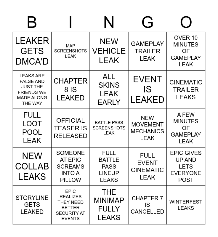 This bingo card has a free space and 24 words: SOMEONE AT EPIC SCREAMS INTO A PILLOW, EPIC REALIZES THEY NEED BETTER SECURITY AT EVENTS, ALL SKINS LEAK EARLY, STORYLINE GETS LEAKED, OVER 10 MINUTES OF GAMEPLAY LEAK, LEAKER GETS DMCA'D, LEAKS ARE FALSE AND JUST THE FRIENDS WE MADE ALONG THE WAY, MAP SCREENSHOTS LEAK, NEW MOVEMENT MECHANICS LEAK, FULL BATTLE PASS LINEUP LEAKS, EVENT IS LEAKED, FULL LOOT POOL LEAK, FULL EVENT CINEMATIC LEAK, EPIC GIVES UP AND LETS EVERYONE POST, CHAPTER 8 IS LEAKED, CHAPTER 7 IS CANCELLED, A FEW MINUTES OF GAMEPLAY LEAK, NEW VEHICLE LEAK, CINEMATIC TRAILER LEAKS, OFFICIAL TEASER IS RELEASED, WINTERFEST LEAKS, NEW COLLAB LEAKS, GAMEPLAY TRAILER LEAK and THE MINIMAP FULLY LEAKS.