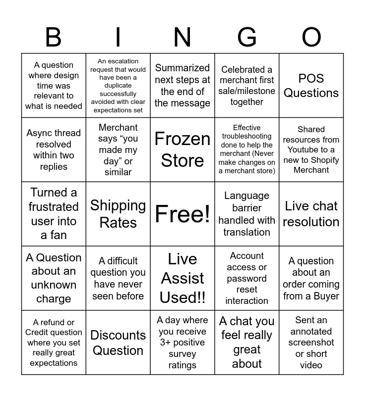 This bingo card has a free space and 24 words: A difficult question you have never seen before, Discounts Question, Frozen Store, A refund or Credit question where you set really great expectations, POS Questions, A question where design time was relevant to what is needed, Async thread resolved within two replies, An escalation request that would have been a duplicate successfully avoided with clear expectations set, Language barrier handled with translation, Live Assist Used!!, Effective troubleshooting done to help the merchant (Never make changes on a merchant store), Turned a frustrated user into a fan, Account access or password reset interaction, A question about an order coming from a Buyer, Merchant says “you made my day” or similar, A chat you feel really great about, Live chat resolution, Summarized next steps at the end of the message, Shared resources from Youtube to a new to Shopify Merchant, Shipping Rates, Sent an annotated screenshot or short video, A Question about an unknown charge, Celebrated a merchant first sale/milestone together and A day where you receive 3+ positive survey ratings.