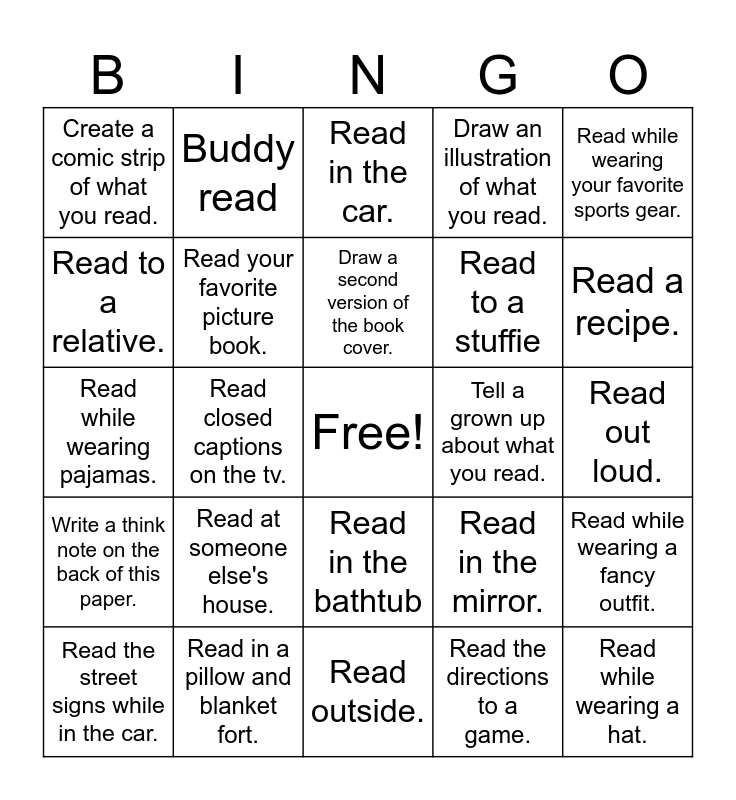 This bingo card has a free space and 24 words: Read at someone else's house., Read in a pillow and blanket fort., Draw a second version of the book cover., Read the street signs while in the car., Read while wearing your favorite sports gear., Create a comic strip of what you read., Read to a relative., Buddy read, Tell a grown up about what you read., Read in the bathtub, Read to a stuffie, Read while wearing pajamas., Read in the mirror., Read while wearing a fancy outfit., Read your favorite picture book., Read the directions to a game., Read out loud., Read in the car., Read a recipe., Read closed captions on the tv., Read while wearing a hat., Write a think note on the back of this paper., Draw an illustration of what you read. and Read outside..