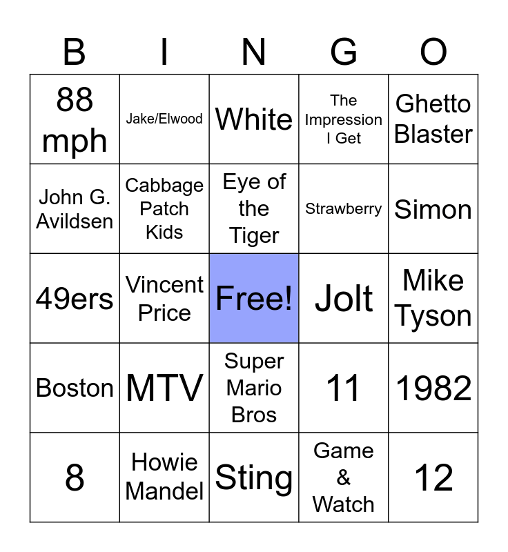 This bingo card has a free space and 40 words: Alien, 49ers, Growing Pains, Cabbage Patch Kids, Howie Mandel, Super Mario Bros, Eye of the Tiger, The Breakfast Club, Ghetto Blaster, Boston, Vincent Price, The Impression I Get, 12, Mike Tyson, Jolt, MTV, Famine Relief in America, 88 mph, Gladys Knight, White, 1982, Game & Watch, Strawberry, John G. Avildsen, Mario Bros, Guns n' Roses, Holiday, The Buggles, 1984, Legwarmers, Blue, 8, Molly Ringwald, 11, Simon, Sting, Titanic, Flashdance, Jake/Elwood and 1984.