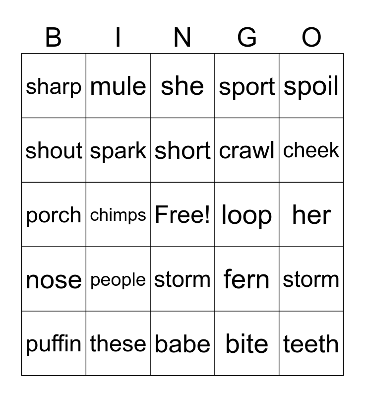 This bingo card has a free space and 24 words: people, these, short, puffin, spoil, sharp, shout, mule, loop, storm, crawl, porch, fern, storm, spark, bite, her, she, cheek, chimps, teeth, nose, sport and babe.