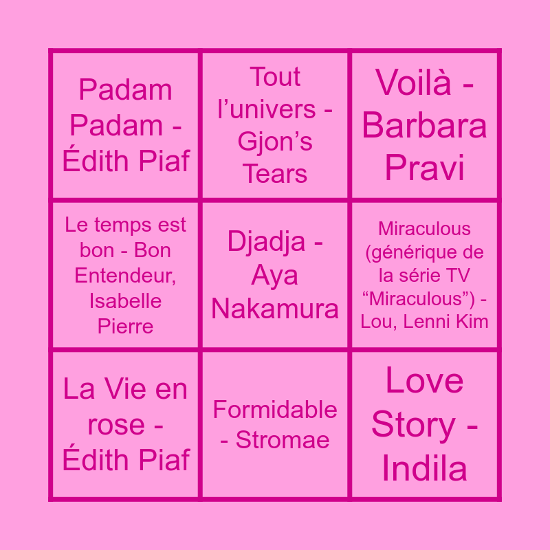 This bingo card has 23 words: Amour plastique - Videoclub, Adèle Castillon, Mattyeux, Copines - Aya Nakamura, Formidable - Stromae, Papaoutai - Stromae, Djadja - Aya Nakamura, Padam Padam - Édith Piaf, Miraculous (générique de la série TV “Miraculous”) - Lou, Lenni Kim, Tout l’univers - Gjon’s Tears, Écoute Chérie - Vendredi sur Mer, C’est beau la bourgeoisie - Variété Française, Est-ce que tu m’aimes? Pilule bleue - GIMS, Love Story - Indila, La Seine - Extrait de la bande originale un monstre à Paris - Vanessa Paradis, -M-, Bad boy - Marwa Loud, Zou bisou bisou - Gillian Hills, Les Champs-Elysées - Joe Dassin, Voilà - Barbara Pravi, Non, je ne regrette rien - Édith Piaf, La Vie en rose - Édith Piaf, Alors on danse (Radio Edit) - Stromae, Le temps est bon - Bon Entendeur, Isabelle Pierre, Ella Elle L A - Kate Ryan and Dernière danse - Indila.