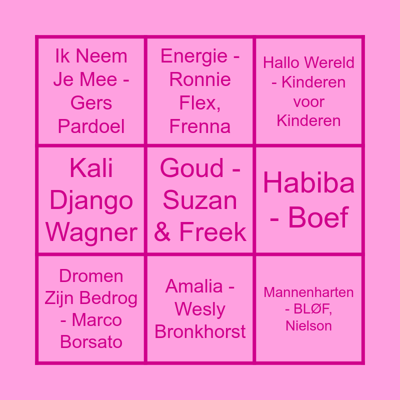 This bingo card has 25 words: Per Spoor (Kedeng Kedeng) - Guus Meeuwis, Vagant, Sugardaddy - Roxy Dekker, Amalia - Wesly Bronkhorst, Oceaan - Racoon, Goud - Suzan & Freek, Ik Neem Je Mee - Gers Pardoel, Habiba - Boef, Energie - Ronnie Flex, Frenna, Een Zomeravond Met Jou - Monique Smit, Tim Douwsma, Bij Ons In Brabant - Rene Schuurmans, Mannenharten - BLØF, Nielson, Leef Nu Het Kan - Jan Smit, Even Aan Mijn Moeder Vragen - Bloem, Rosanne - Nick & Simon, Dromen Zijn Bedrog - Marco Borsato, Spijt Is Voor Later - Martin Morero, Maak Me Gek - Gerard Joling, Hallo Wereld - Kinderen voor Kinderen, Limburg - Rowwen Hèze, Wereldwonder - LA$$A, Poke, John West, Billy Dans, Toppertje! (Original Mix) - Guillermo, Tropical Danny, Cowboys & Indianen - Dikdakkers, Helena 2.0 - Rutger van Barneveld, Kali Django Wagner and Zij Gelooft In Mij - Andre Hazes.