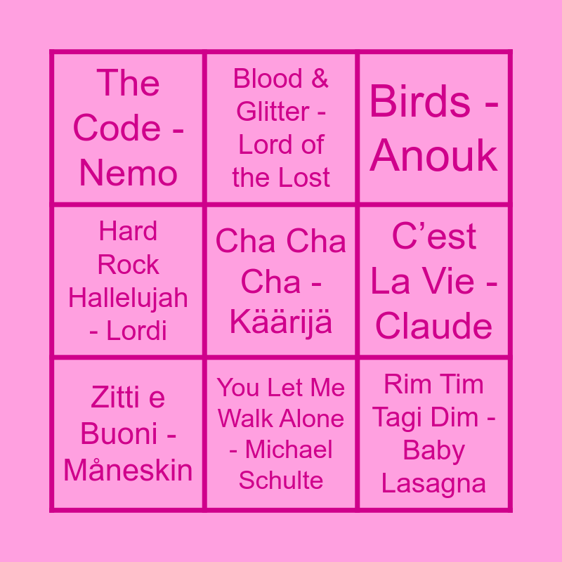 This bingo card has 23 words: Amsterdam - Maggie MacNeal, Espresso Macchiato - Tommy Cash, You Let Me Walk Alone - Michael Schulte, Doomsday blue - Bambie Thug, Cha Cha Cha - Käärijä, The Code - Nemo, C’est La Vie - Claude, Blood & Glitter - Lord of the Lost, Europapa - Joost, Euphoria - Loreen, Queen of Kings - Alessandra, Rim Tim Tagi Dim - Baby Lasagna, Wasted Love - JJ, Heroes - Måns Zelmerlöw, Waterloo - ABBA, Dark Side - Blind Channel, Birds - Anouk, Teresa & Maria - Alyona Alyona, Jerry Heil, Zitti e Buoni - Måneskin, SNAP - Rosa Linn, Hard Rock Hallelujah - Lordi, Bara Bada Bastu - KAJ and Fairytale - Alexander Rybak.
