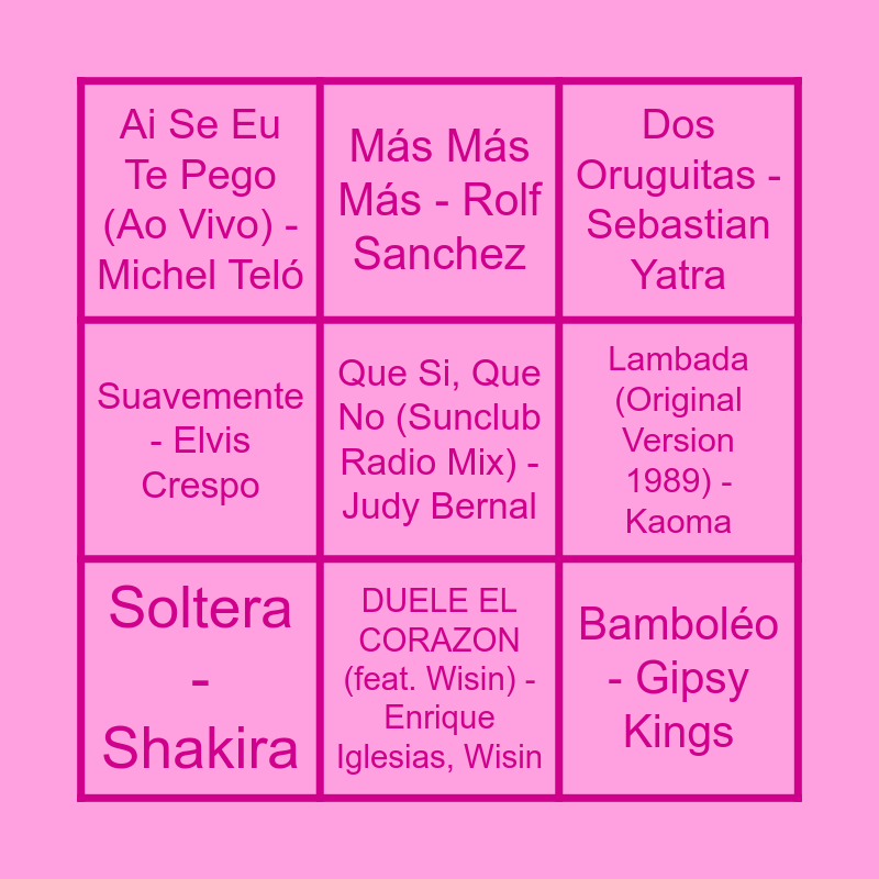 This bingo card has a free space and 24 words: Échame La Culpa - Luis Fonsi, Demi Lovato, Reggaetón Lento (Remix) - CNCO, Little Mix, DUELE EL CORAZON (feat. Wisin) - Enrique Iglesias, Wisin, Chan Chan - Buena Vista Social Club, Bamboléo - Gipsy Kings, Ai Se Eu Te Pego (Ao Vivo) - Michel Teló, Lambada (Original Version 1989) - Kaoma, Más Más Más - Rolf Sanchez, La Bomba (Original Radio Mix) - King Africa, Gasolina - Daddy Yankee, Conga! - Miami Sound Machina, Sarà perché ti amo - Ricchi E Poveri, El Perdón (with Enrique Iglesias) - Nicky Jam, Enrique Iglesias, Me Gustas Tu - Manu Chao, Soltera - Shakira, Una Chica Especial - ALES, Volare (Nel Blu di Pinto di Blu) - Gipsy Kings, Dos Oruguitas - Sebastian Yatra, Un Poco Loco - Luis Ángel Gómez Jaramillo, Gael Garcia Bernal, Vamos a la Playa (1983) - Righeira, La Bamba - Los Lobos, Guantanamera - Eclipse, Suavemente - Elvis Crespo and Con Calma - Daddy Yankee, Snow.