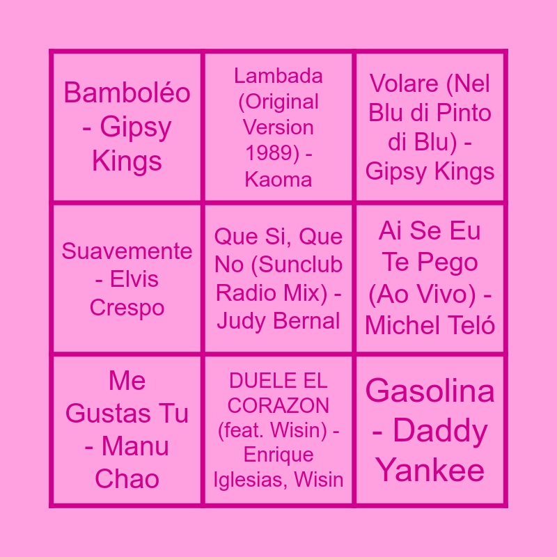 This bingo card has 25 words: Échame La Culpa - Luis Fonsi, Demi Lovato, Reggaetón Lento (Remix) - CNCO, Little Mix, DUELE EL CORAZON (feat. Wisin) - Enrique Iglesias, Wisin, Chan Chan - Buena Vista Social Club, Que Si, Que No (Sunclub Radio Mix) - Judy Bernal, Bamboléo - Gipsy Kings, Ai Se Eu Te Pego (Ao Vivo) - Michel Teló, Lambada (Original Version 1989) - Kaoma, Más Más Más - Rolf Sanchez, La Bomba (Original Radio Mix) - King Africa, Gasolina - Daddy Yankee, Conga! - Miami Sound Machina, Sarà perché ti amo - Ricchi E Poveri, El Perdón (with Enrique Iglesias) - Nicky Jam, Enrique Iglesias, Me Gustas Tu - Manu Chao, Soltera - Shakira, Una Chica Especial - ALES, Volare (Nel Blu di Pinto di Blu) - Gipsy Kings, Dos Oruguitas - Sebastian Yatra, Un Poco Loco - Luis Ángel Gómez Jaramillo, Gael Garcia Bernal, Vamos a la Playa (1983) - Righeira, La Bamba - Los Lobos, Guantanamera - Eclipse, Suavemente - Elvis Crespo and Con Calma - Daddy Yankee, Snow.