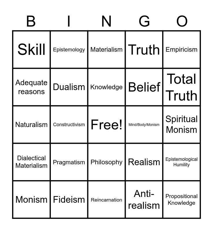 This bingo card has a free space and 32 words: Anti-realism, Knowledge by acquaintance, Constructivism, Correspondence Theory of Truth, Dialectical Materialism, Dualism, Empiricism, Epistemological Humility, Epistemology, Foundationalism, Knowledge, Materialism, Metaphysics, Mind/Body/Dualism, Mind/Body/Monism, Mind/Body Problem, Monism, Naturalism, Philosophy, Pragmatism, Realism, Scientific Empiricism, Spiritual Monism, Fideism, Propositional Knowledge, Truth, Belief, Adequate reasons, Skill, Reincarnation, Polytheism and Total Truth.