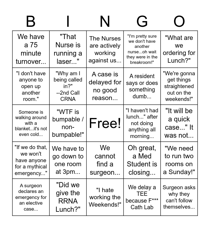 This bingo card has a free space and 24 words: We have to go down to one room at 3pm..., "Did we give the RRNA Lunch?", A case is delayed for no good reason..., A surgeon declares an emergency for an elective case..., "What are we ordering for Lunch?", We have a 75 minute turnover..., "I don't have anyone to open up another room.", "That Nurse is running a laser...", "I haven't had lunch..." after not doing anything all morning..., We cannot find a surgeon..., A resident says or does something dumb..., Someone is walking around with a blanket...it's not even cold..., Oh great, a Med Student is closing..., "We need to run two rooms on a Sunday!", "Why am I being called in?" --2nd Call CRNA, We delay a TEE because F*** Cath Lab, "It will be a quick case..." It was not..., The Nurses are actively working against us..., "We're gonna get things straightened out on the weekends!", "WTF is bumpable / non-bumpable!", Surgeon asks why they can't follow themselves..., "If we do that, we won't have anyone for a mythical emergency...", "I'm pretty sure we don't have another nurse...oh wait they were in the breakroom!" and "I hate working the Weekends!".
