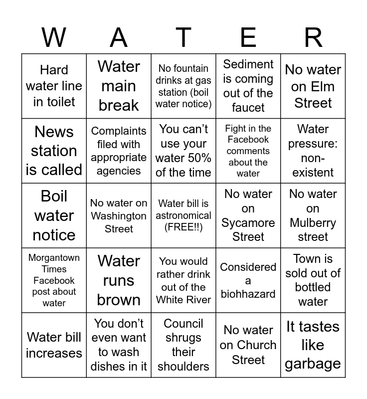 This bingo card has a free space and 24 words: Water runs brown, You don’t even want to wash dishes in it, You can’t use your water 50% of the time, Water bill increases, No water on Elm Street, Hard water line in toilet, News station is called, Water main break, No water on Sycamore Street, You would rather drink out of the White River, Fight in the Facebook comments about the water, Boil water notice, Considered a biohhazard, Town is sold out of bottled water, Complaints filed with appropriate agencies, No water on Church Street, No water on Mulberry street, No fountain drinks at gas station (boil water notice), Water pressure: non-existent, No water on Washington Street, It tastes like garbage, Morgantown Times Facebook post about water, Sediment is coming out of the faucet and Council shrugs their shoulders.