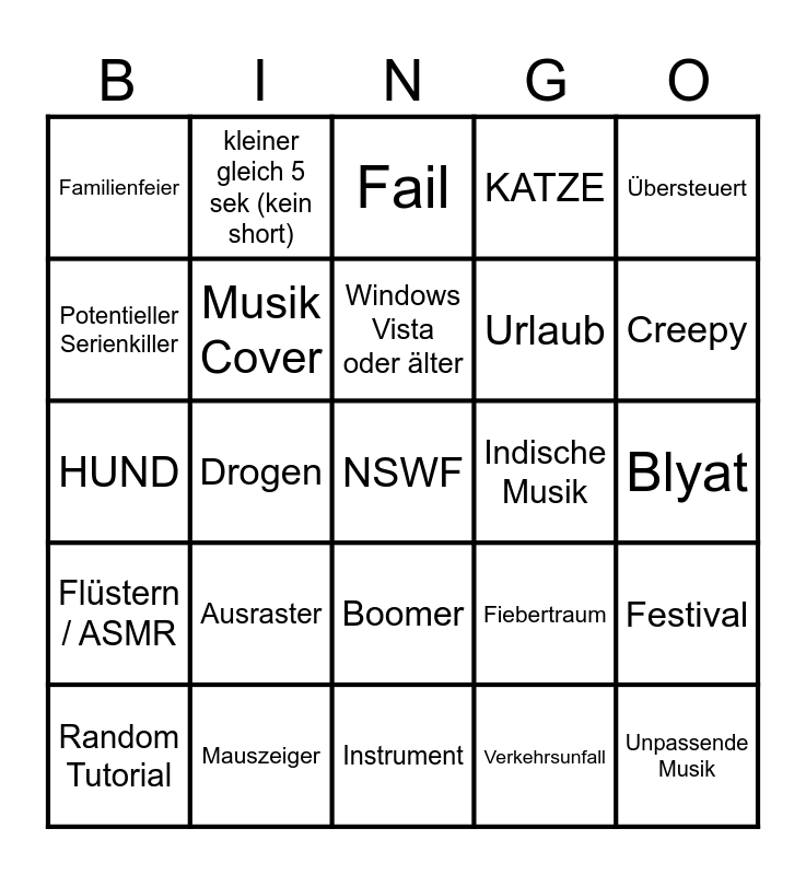 This bingo card has 25 words: Ausraster, Instrument, Windows Vista oder älter, Random Tutorial, Übersteuert, Familienfeier, Potentieller Serienkiller, kleiner gleich 5 sek (kein short), Indische Musik, Boomer, Urlaub, HUND, Fiebertraum, Festival, Musik Cover, Unpassende Musik, Blyat, Fail, Creepy, Drogen, NSWF, Mauszeiger, Flüstern / ASMR, KATZE and Verkehrsunfall.