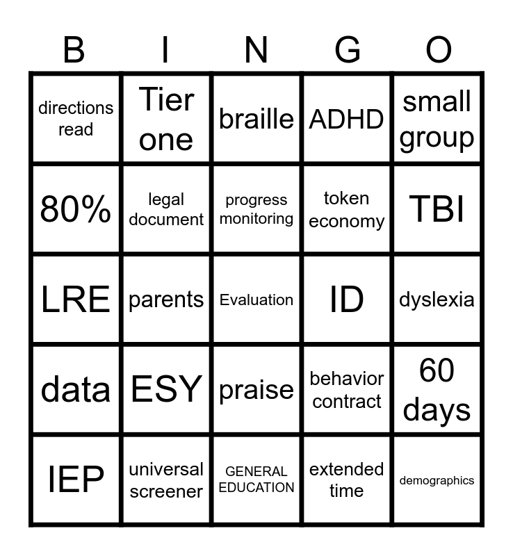 This bingo card has a free space and 24 words: ESY, universal screener, progress monitoring, IEP, small group, directions read, 80%, Tier one, ID, praise, token economy, LRE, behavior contract, 60 days, legal document, extended time, dyslexia, braille, TBI, parents, demographics, data, ADHD and GENERAL EDUCATION.