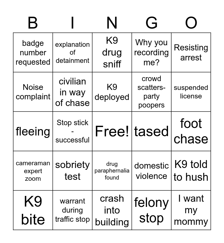 This bingo card has a free space and 34 words: Called off traffic stop, felony stop, underpants shown, no license or insurance, cameraman expert zoom, civilian in way of chase, Resisting arrest, K9 bite, explanation of detainment, PIT, K9 deployed, K9 drug sniff, camera man jumps fence, fentanyl found!, tased, suspended license, warrant during traffic stop, fleeing, sobriety test, domestic violence, drug paraphernalia found, traffic accident, badge number requested, foot chase, crash into building, I want my mommy, Why you recording me?, just filming a documemtary, crowd scatters-party poopers, Noise complaint, stolen car, Stop stick - successful, K9 told to hush and Officer heavy breathing.