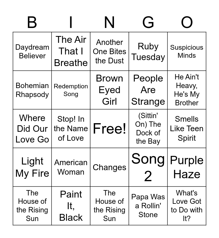 This bingo card has a free space and 50 words: Should I Stay or Should I Go?, What's Love Got to Do with It?, I Want to Know What Love Is?, The House of the Rising Sun, American Woman, I Can't Help Myself, The Air That I Breathe, Nights in White Satin, Bohemian Rhapsody, Life on Mars?, Redemption Song, Ruby Tuesday, Purple Haze, Song 2, The Boy with the Thorn in His Side, London Calling, Brown Eyed Girl, (Sittin' On) The Dock of the Bay, I Got You (I Feel Good), Suspicious Minds, Stop! In the Name of Love, Papa Was a Rollin' Stone, Daydream Believer, People Are Strange, These Eyes, Reach Out I'll Be There, He Ain't Heavy, He's My Brother, Tuesday Afternoon, Another One Bites the Dust, Changes, No Woman, No Cry, Sympathy for the Devil, All Along the Watchtower, Yesterday, Paint It, Black, Like a Rolling Stone, Superstition, Material Girl, Kiss, Smells Like Teen Spirit, Lovesong, The Queen Is Dead, Should I Stay or Should I Go, Lola, The House of the Rising Sun, Where Did Our Love Go, My Girl, I'm a Believer, Light My Fire and Do you believe in magic?.