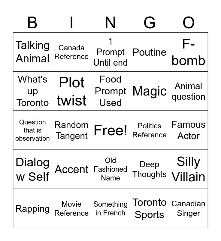 This bingo card has a free space and 24 words: Accent, Movie Reference, Food Prompt Used, Rapping, F-bomb, Talking Animal, What's up Toronto, Canada Reference, Politics Reference, Old Fashioned Name, Magic, Question that is observation, Deep Thoughts, Silly Villain, Plot twist, Toronto Sports, Famous Actor, 1 Prompt Until end, Animal question, Random Tangent, Canadian Singer, Dialog w Self, Poutine and Something in French.