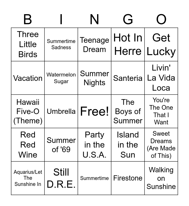 This bingo card has a free space and 50 words: Good Vibrations, Walking on Sunshine, In the Summertime, Summertime, Summer of '69, Summer, Summertime Sadness, Green Light, Vacation, Summer in the City, Watermelon Sugar, Hot In Herre, Sweet Dreams (Are Made of This), Island in the Sun, Soak Up The Sun, School's Out, Summer Nights, The Boys of Summer, All Summer Long, Get Lucky, Umbrella, Firestone, Three Little Birds, Santeria, Californication, Summertime Blues, Livin' La Vida Loca, Cruel Summer, Teenage Dream, Party in the U.S.A., The Boys of Summer (Cover), Jump, Dancing In The Street, The Tide Is High, Still D.R.E., Amber, Drop It Like It's Hot, We're Going to Ibiza!, Miami, You're The One That I Want, Rockaway Beach, Under the Boardwalk, Lost, Happy, Aquarius/Let The Sunshine In, Hawaii Five-O (Theme), Toes, Summertime, Red Red Wine and It Wasn't Me.