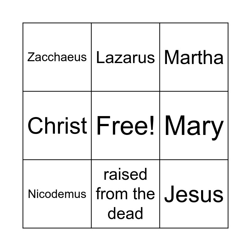 This bingo card has a free space and 8 words: Mary, Martha, Lazarus, Nicodemus, Zacchaeus, Jesus, Christ and raised from the dead.