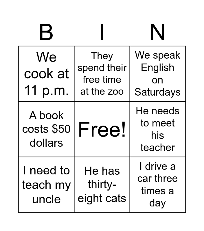 This bingo card has a free space and 19 words: My sister makes banana cake for breakfast, He has twenty-six books, We speak English on Saturdays, She works at the mall, They ride a bike at 4 p.m., I drive a car three times a day, I prepare my lunch in the kitchen, We cook at 11 p.m., They spend their free time at the zoo, She likes to wear dresses, It costs $1000 dollars, He needs to meet his teacher, I need to teach my uncle, Yes, I come from the countryside, They sometimes wake up early, She always goes to bed late, A book costs $50 dollars, He has thirty- eight cats and She teaches English.