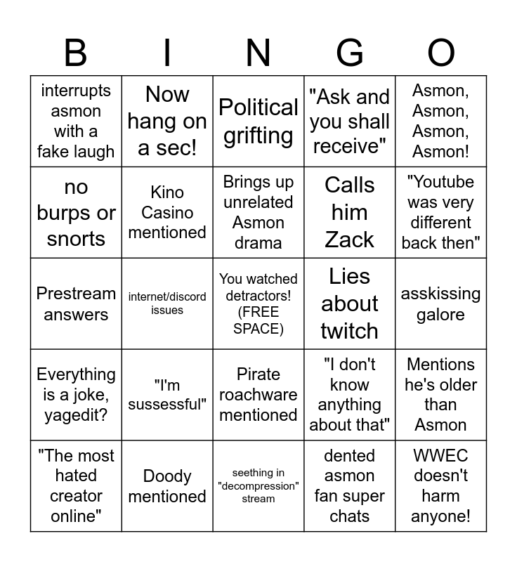 This bingo card has a free space and 24 words: "I'm sussessful", Doody mentioned, Brings up unrelated Asmon drama, "The most hated creator online", Asmon, Asmon, Asmon, Asmon!, interrupts asmon with a fake laugh, no burps or snorts, Now hang on a sec!, Lies about twitch, Pirate roachware mentioned, Calls him Zack, Prestream answers, "I don't know anything about that", Mentions he's older than Asmon, Kino Casino mentioned, dented asmon fan super chats, asskissing galore, Political grifting, "Youtube was very different back then", internet/discord issues, WWEC doesn't harm anyone!, Everything is a joke, yagedit?, "Ask and you shall receive" and seething in "decompression" stream.