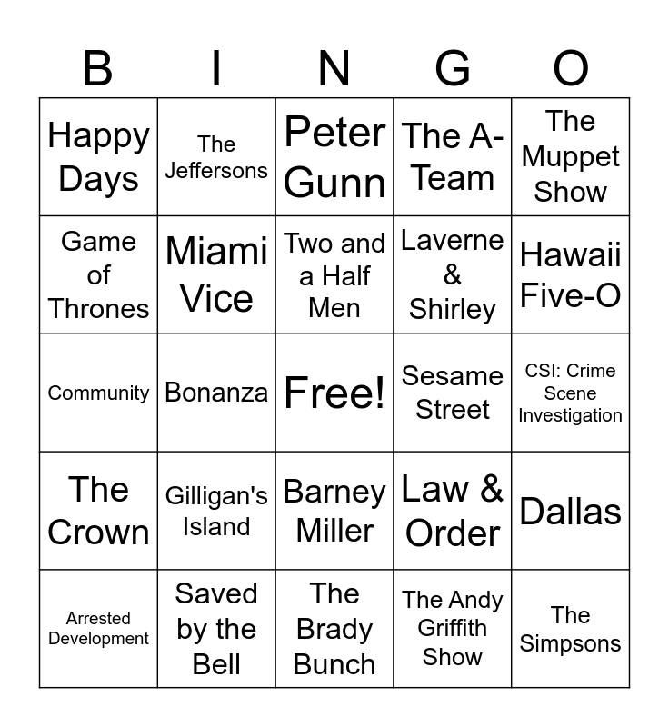 This bingo card has a free space and 50 words: Friends, The Simpsons, Cheers, The Brady Bunch, Gilligan's Island, The Addams Family, The Jeffersons, The Fresh Prince of Bel-Air, Game of Thrones, Stranger Things, Miami Vice, The A-Team, Dallas, Law & Order, Seinfeld, The Big Bang Theory, Two and a Half Men, Sesame Street, Mister Rogers' Neighborhood, The Muppet Show, Bonanza, The Andy Griffith Show, Happy Days, Laverne & Shirley, M*A*S*H, The Twilight Zone, Hawaii Five-O, James Bond Theme (Used for various spy shows), Peter Gunn, Barney Miller, MacGyver, Knight Rider, Magnum P.I., Full House, Saved by the Bell, Power Rangers, Pokémon, Spongebob Squarepants, The Sopranos, CSI: Crime Scene Investigation, House M.D., Succession, The Office (US), Parks and Recreation, Arrested Development, Community, Brooklyn Nine-Nine, The Marvelous Mrs. Maisel, The Crown and Doctor Who.