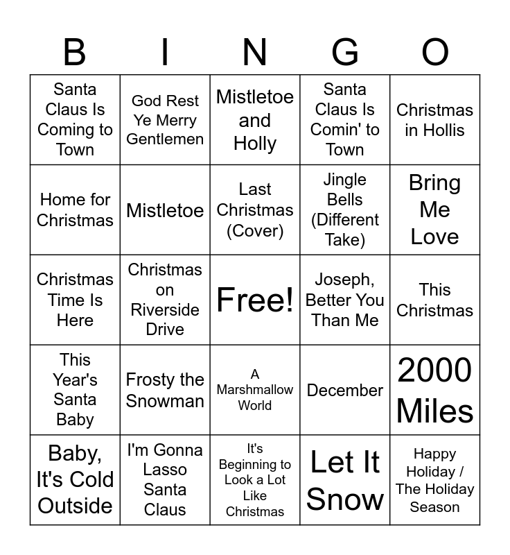 This bingo card has a free space and 50 words: December Song (I Dreamed of Christmas), Happy Holiday / The Holiday Season, Christmas Isn't Canceled (Just You), It's Beginning to Look a Lot Like Christmas, Frosty the Snowman, Merry Christmas Darling, God Rest Ye Merry Gentlemen, I'll Be Home for Christmas, Home for Christmas, Christmas Tree Farm, Mistletoe, Santa Claus Is Comin' to Town, 2000 Miles, December, Twelve Days of Christmas, This Christmas, Last Christmas (Cover), Joseph, Better You Than Me, Christmas in the Sand, Christmas in Hollis, Christmas on Riverside Drive, Let It Snow, Santa Claus Is Coming to Town, Jingle Bells (Different Take), Little Saint Nick, Linus and Lucy (Theme), Bring Me Love, Like It's Christmas, Mistletoe and Holly, A Marshmallow World, Mary, Did You Know?, O Holy Night, Deck the Halls (Different Version), The Christmas Song (Chestnuts Roasting), I'm Gonna Lasso Santa Claus, Frosty the Snowman (Different Version), Santa Claus Goes Straight To The Ghetto, Do They Know It's Christmas? (Cover), Santa Baby (Different Version), This Christmas, Shake Up Christmas, White Christmas (Different Version), Merry Christmas Baby (Different Version), Christmas Tree, Baby, It's Cold Outside, Christmas Time Is Here, Santa Claus Is Back In Town, Put a Little Love in Your Heart, This Year's Santa Baby and Give Love on Christmas Day.