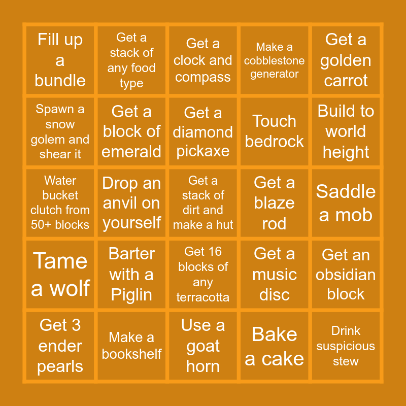 This bingo card has a free space and 25 words: Barter with a Piglin, Use a goat horn, Get a diamond pickaxe, Get 3 ender pearls, Get a golden carrot, Fill up a bundle, Spawn a snow golem and shear it, Get a stack of any food type, Get a blaze rod, Get 16 blocks of any terracotta, Touch bedrock, Water bucket clutch from 50+ blocks, Get a music disc, Get an obsidian block, Get a block of emerald, Kill a mob with a bow, Saddle a mob, Get a clock and compass, Build to world height, Drop an anvil on yourself, Drink suspicious stew, Make a bookshelf, Tame a wolf, Make a cobblestone generator and Bake a cake.