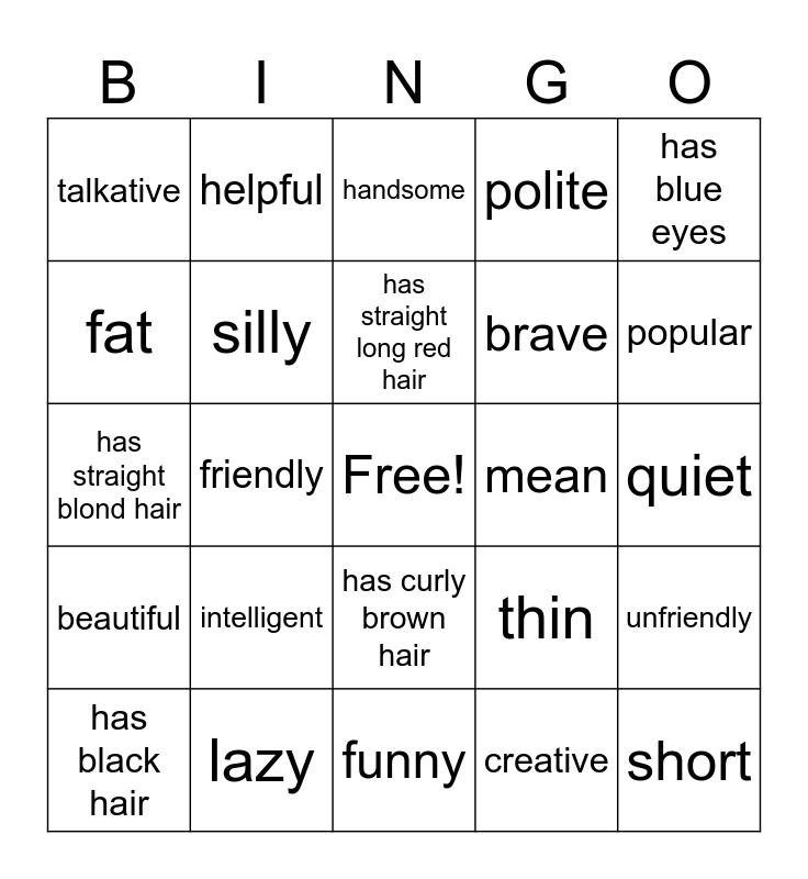 This bingo card has a free space and 29 words: has black hair, tall, friendly, has red short hair, talkative, handsome, silly, intelligent, mean, lazy, quiet, short, funny, creative, popular, grumpy, has curly brown hair, beautiful, has blue eyes, has straight blond hair, thin, bald, brave, fat, polite, helpful, unfriendly, has straight long red hair and cheerful.