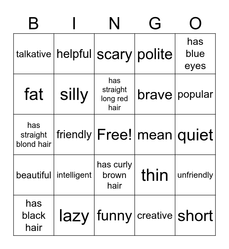 This bingo card has a free space and 29 words: has black hair, tall, friendly, has red short hair, talkative, scary, silly, intelligent, mean, lazy, quiet, short, funny, creative, popular, handsome, has curly brown hair, beautiful, has blue eyes, has straight blond hair, thin, bald, brave, fat, polite, helpful, unfriendly, has straight long red hair and cheerful.