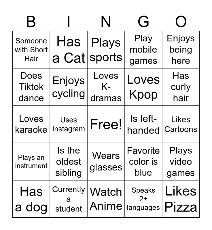 This bingo card has a free space and 29 words: Loves midnight snacks, Currently a student, Plays sports, Same birth month as you, Enjoys being here, Someone with Short Hair, Enjoys cycling, Loves K-dramas, Is left-handed, Plays video games, Has a dog, Uses Instagram, Speaks 2+ languages, Likes Pizza, Loves karaoke, Cannot live without coffee, Watch Anime, Favorite color is blue, Has curly hair, Plays an instrument, Is the oldest sibling, Can cook, Loves Kpop, Likes Cartoons, Does Tiktok dance, Has a Cat, Wears glasses, Play mobile games and Wears all black.