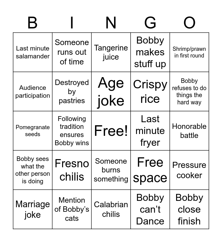 This bingo card has a free space and 25 words: Fresno chilis, Calabrian chilis, Age joke, Marriage joke, Shrimp/prawn in first round, Last minute salamander, Audience participation, Someone runs out of time, Last minute fryer, Someone burns something, Crispy rice, Pomegranate seeds, Free space, Pressure cooker, Destroyed by pastries, James beard award mention, Honorable battle, Tangerine juice, Bobby refuses to do things the hard way, Following tradition ensures Bobby wins, Bobby close finish, Mention of Bobby’s cats, Bobby sees what the other person is doing, Bobby makes stuff up and Bobby can’t Dance.