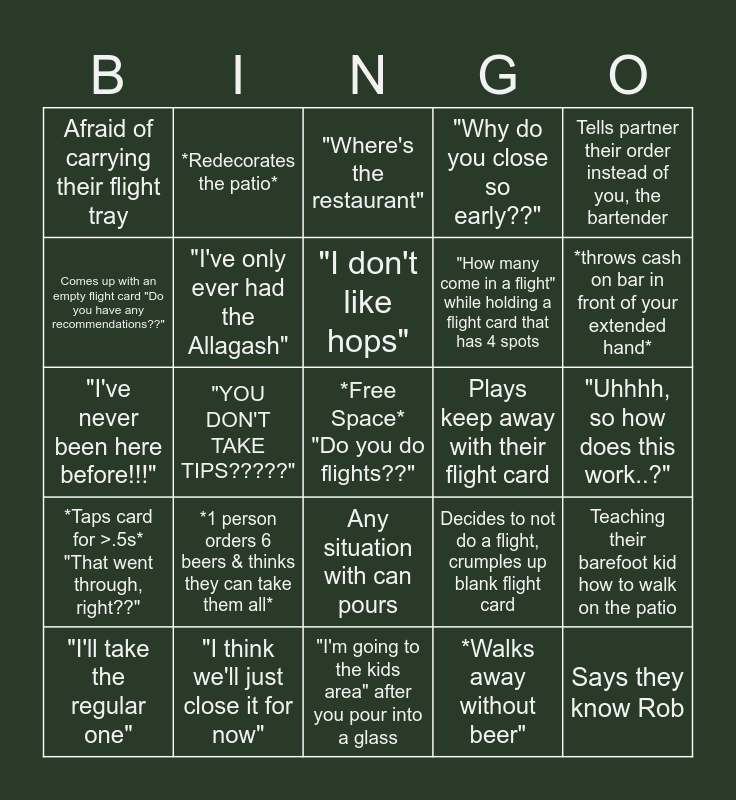 This bingo card has a free space and 24 words: "I'll take the regular one", *1 person orders 6 beers & thinks they can take them all*, "I don't like hops", *Walks away without beer", Tells partner their order instead of you, the bartender, Afraid of carrying their flight tray, *Redecorates the patio*, "Where's the restaurant", Plays keep away with their flight card, "Uhhhh, so how does this work..?", "I've never been here before!!!", "I've only ever had the Allagash", Decides to not do a flight, crumples up blank flight card, Teaching their barefoot kid how to walk on the patio, Comes up with an empty flight card "Do you have any recommendations??", "I think we'll just close it for now", "I'm going to the kids area" after you pour into a glass, "Why do you close so early??", *throws cash on bar in front of your extended hand*, *Taps card for >.5s* "That went through, right??", "YOU DON'T TAKE TIPS?????", Any situation with can pours, "How many come in a flight" while holding a flight card that has 4 spots and Says they know Rob.