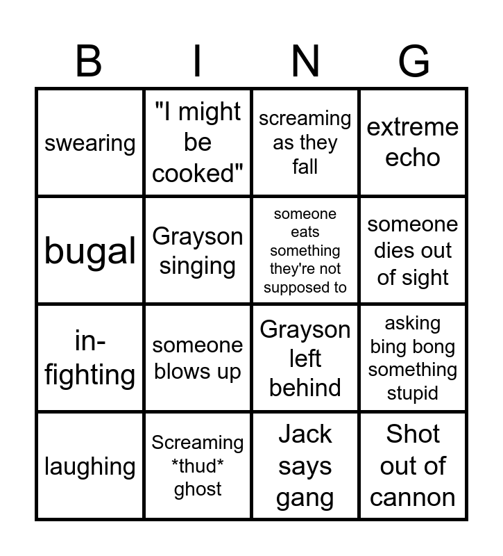 This bingo card has 16 words: Screaming *thud* ghost, asking bing bong something stupid, screaming as they fall, swearing, in-fighting, "I might be cooked", Grayson left behind, Jack says gang, bugal, Grayson singing, laughing, extreme echo, someone blows up, someone dies out of sight, someone eats something they're not supposed to and Shot out of cannon.