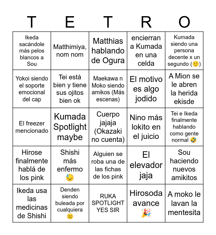This bingo card has a free space and 24 words: Shishi más enfermo 😓, Denden siendo buleada por cualquiera ☹️, Maekawa n Moko siendo amikos (Más escenas), Ikeda usa las medicinas de Shishi, Kumada siendo una persona decente x un segundo (🙂), Ikeda sacándole más pelos blancos a Sou, Yokoi siendo el soporte emocional del cap, Matthimiya, nom nom, Nino más lokito en el juicio, Alguien se roba una de las fichas de los pink, El motivo es algo jodido, El freezer mencionado, El elevador jaja, Sou haciendo nuevos amikitos, Tei está bien y tiene sus ojitos bien ok, Hirosoda avance 🎉, Tei e Ikeda finalmente hablando como gente normal 🤣, Matthias hablando de Ogura, A Mion se le abren la herida ekisde, Kumada Spotlight maybe, A moko le lavan la mentesita, Hirose finalmente hablá de los pink, encierran a Kumada en una celda and RUKA SPOTLIGHT YES SIR.