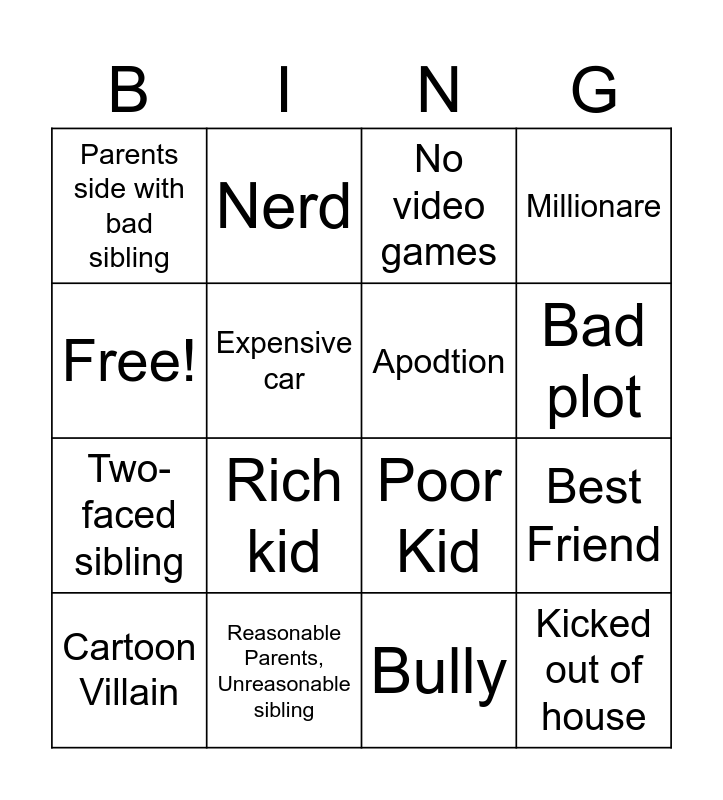 This bingo card has 16 words: Reasonable Parents, Unreasonable sibling, Best Friend, No video games, Parents side with bad sibling, Two-faced sibling, Nerd, Poor Kid, Bully, Free!, Expensive car, Cartoon Villain, Millionare, Rich kid, Bad plot, Apodtion and Kicked out of house.