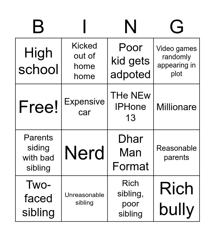 This bingo card has 16 words: Unreasonable sibling, Reasonable parents, Poor kid gets adpoted, High school, Parents siding with bad sibling, Kicked out of home home, Dhar Man Format, Rich sibling, poor sibling, Free!, Expensive car, Two-faced sibling, Video games randomly appearing in plot, Nerd, Millionare, THe NEw IPHone 13 and Rich bully.