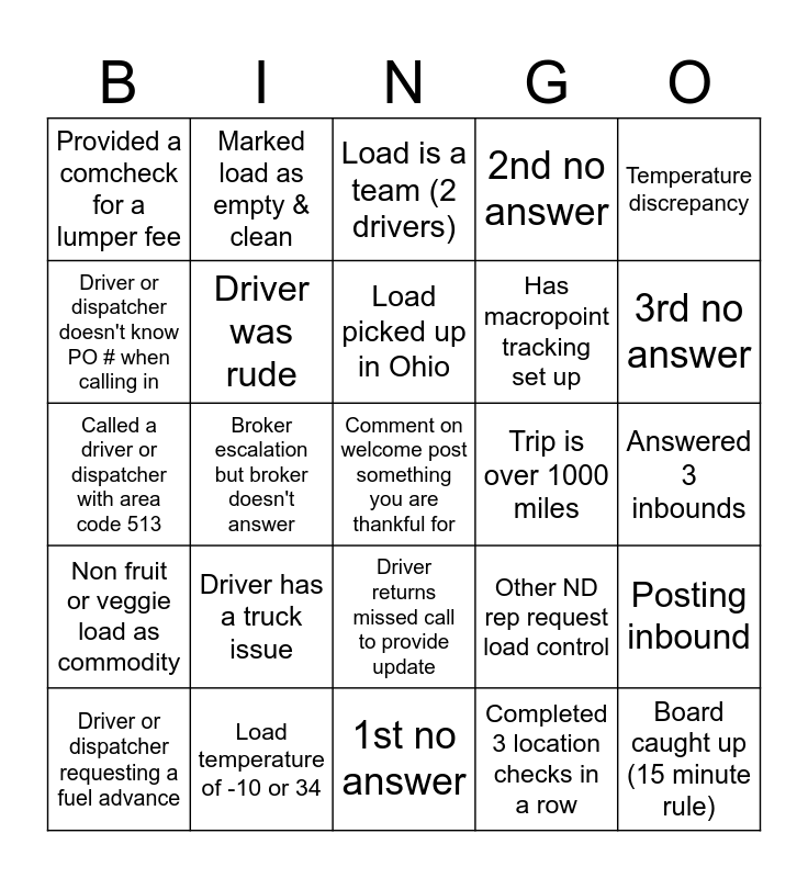 This bingo card has a free space and 24 words: Driver or dispatcher requesting a fuel advance, Driver has a truck issue, Load picked up in Ohio, Completed 3 location checks in a row, Temperature discrepancy, Provided a comcheck for a lumper fee, Marked load as empty & clean, Load is a team (2 drivers), Trip is over 1000 miles, Answered 3 inbounds, Called a driver or dispatcher with area code 513, Driver was rude, Other ND rep request load control, Posting inbound, Driver or dispatcher doesn't know PO # when calling in, Load temperature of -10 or 34, 1st no answer, 2nd no answer, 3rd no answer, Non fruit or veggie load as commodity, Broker escalation but broker doesn't answer, Driver returns missed call to provide update, Has macropoint tracking set up and Board caught up (15 minute rule).