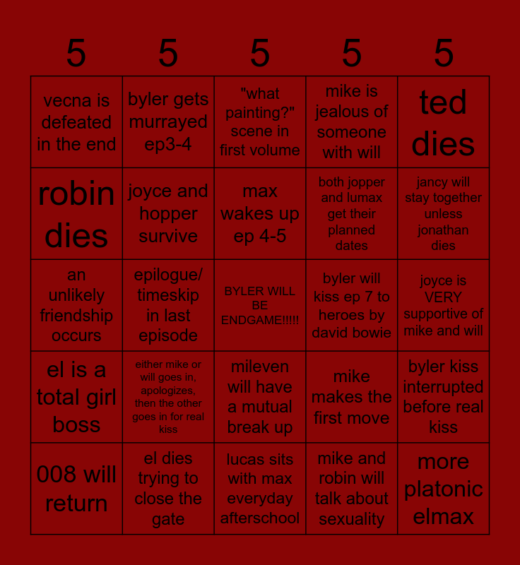 This bingo card has a free space and 24 words: either mike or will goes in, apologizes, then the other goes in for real kiss, el dies trying to close the gate, max wakes up ep 4-5, 008 will return, ted dies, vecna is defeated in the end, robin dies, byler gets murrayed ep3-4, byler will kiss ep 7 to heroes by david bowie, mileven will have a mutual break up, both jopper and lumax get their planned dates, an unlikely friendship occurs, mike makes the first move, byler kiss interrupted before real kiss, joyce and hopper survive, mike and robin will talk about sexuality, joyce is VERY supportive of mike and will, "what painting?" scene in first volume, jancy will stay together unless jonathan dies, epilogue/ timeskip in last episode, more platonic elmax, el is a total girl boss, mike is jealous of someone with will and lucas sits with max everyday afterschool.