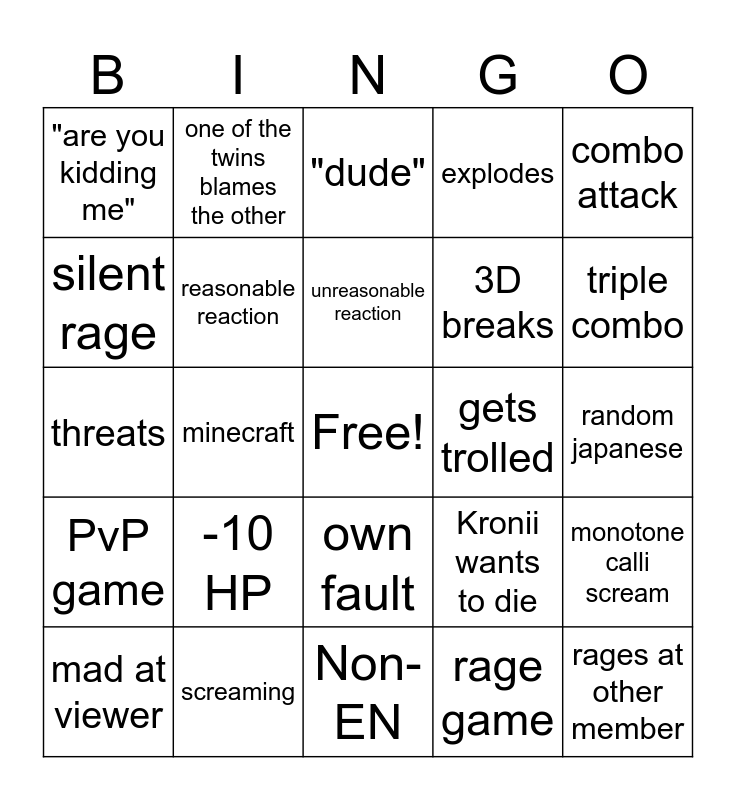 This bingo card has a free space and 24 words: -10 HP, screaming, unreasonable reaction, mad at viewer, combo attack, "are you kidding me", silent rage, one of the twins blames the other, gets trolled, own fault, 3D breaks, threats, Kronii wants to die, monotone calli scream, reasonable reaction, rage game, random japanese, "dude", triple combo, minecraft, rages at other member, PvP game, explodes and Non-EN.