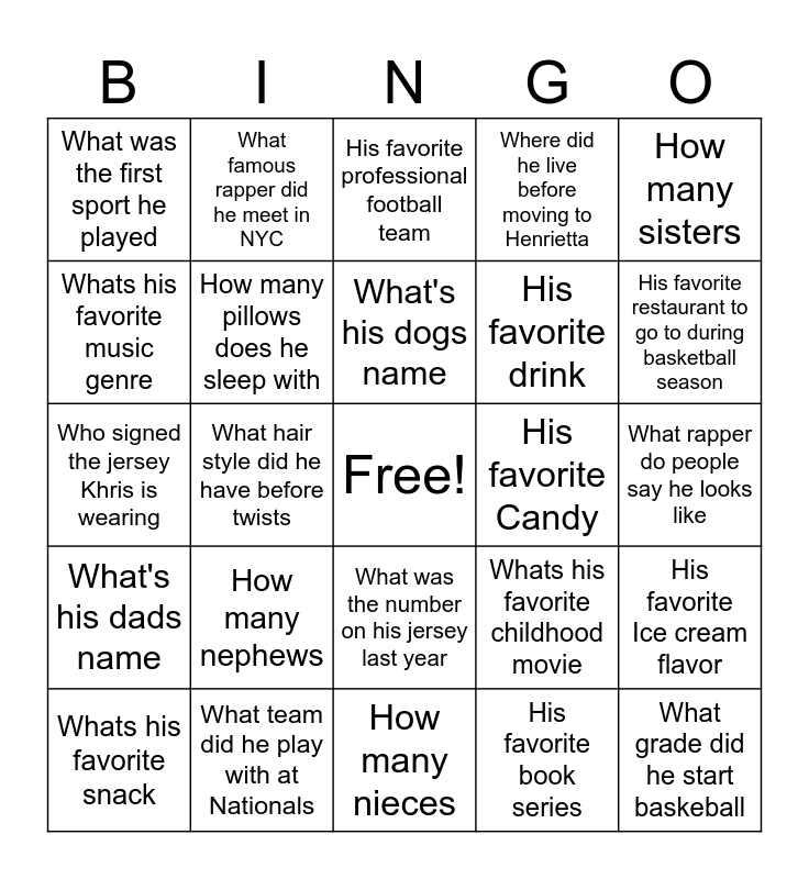 This bingo card has a free space and 24 words: How many nephews, What team did he play with at Nationals, What's his dogs name, Whats his favorite snack, How many sisters, What was the first sport he played, Whats his favorite music genre, What famous rapper did he meet in NYC, His favorite Candy, What was the number on his jersey last year, His favorite drink, Who signed the jersey Khris is wearing, Whats his favorite childhood movie, His favorite Ice cream flavor, How many pillows does he sleep with, His favorite book series, What rapper do people say he looks like, His favorite professional football team, His favorite restaurant to go to during basketball season, What hair style did he have before twists, What grade did he start baskeball, What's his dads name, Where did he live before moving to Henrietta and How many nieces.