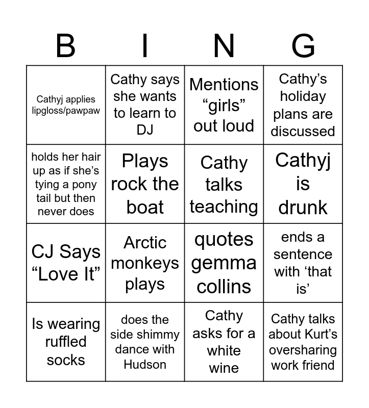 This bingo card has 16 words: does the side shimmy dance with Hudson, ends a sentence with ‘that is’, Mentions “girls” out loud, Cathyj applies lipgloss/pawpaw, CJ Says “Love It”, Cathy says she wants to learn to DJ, quotes gemma collins, Cathy asks for a white wine, holds her hair up as if she’s tying a pony tail but then never does, Plays rock the boat, Is wearing ruffled socks, Cathy’s holiday plans are discussed, Arctic monkeys plays, Cathyj is drunk, Cathy talks teaching and Cathy talks about Kurt’s oversharing work friend.