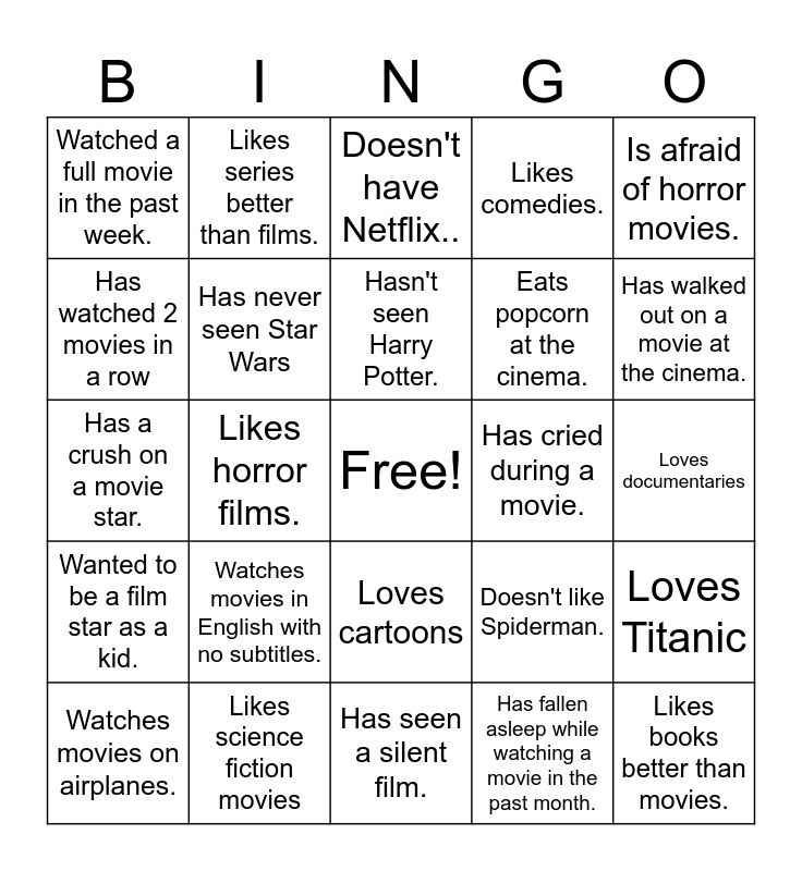 This bingo card has a free space and 24 words: Watches movies in English with no subtitles., Likes science fiction movies, Hasn't seen Harry Potter., Watches movies on airplanes., Is afraid of horror movies., Watched a full movie in the past week., Has watched 2 movies in a row, Likes series better than films., Has cried during a movie., Loves cartoons, Eats popcorn at the cinema., Has a crush on a movie star., Doesn't like Spiderman., Loves Titanic, Has never seen Star Wars, Has fallen asleep while watching a movie in the past month., Loves documentaries, Doesn't have Netflix.., Has walked out on a movie at the cinema., Likes horror films., Likes books better than movies., Wanted to be a film star as a kid., Likes comedies. and Has seen a silent film..