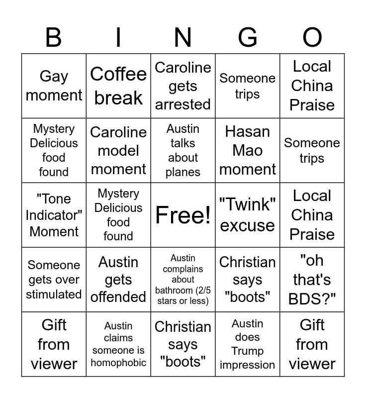 This bingo card has a free space and 56 words: Scat Sesh, Gift from viewer, "Twink" excuse, Gay moment, Christian says "boots", Caroline gets arrested, Caroline model moment, Austin talks about planes, Hasan Mao moment, Bad food moment, Someone trips, Communism moment, Fashion moment, Gets approached by police, Gets kicked out, Tunnel F, Local China Praise, Mystery Delicious food found, Scat Sesh, Gift from viewer, "Twink" excuse, Gay moment, Christian says "boots", Caroline gets arrested, Caroline model moment, Austin talks about planes, Hasan Mao moment, Bad food moment, Someone trips, Communism moment, Fashion moment, Gets approached by police, Gets kicked out, Tunnel F, Local China Praise, Mystery Delicious food found, "Tone Indicator" Moment, Visit historical sight, Someone gets over stimulated, Coffee break, Austin complains about bathroom (2/5 stars or less), Someone loses something, Hasan gets stuck with the bill, Hasan rizzes local, Fear& Viewer, Austin gets offended, Austin claims someone is homophobic, Austin and Christian moment <3, Will and Hasan moment <3, Austin and Hasan moment <3, Austin does Trump impression, "I will voooote for Donald Trump", Broadway Musical moment, Austin talks about BDS, "oh that's BDS?" and "Kwan Dynasty".