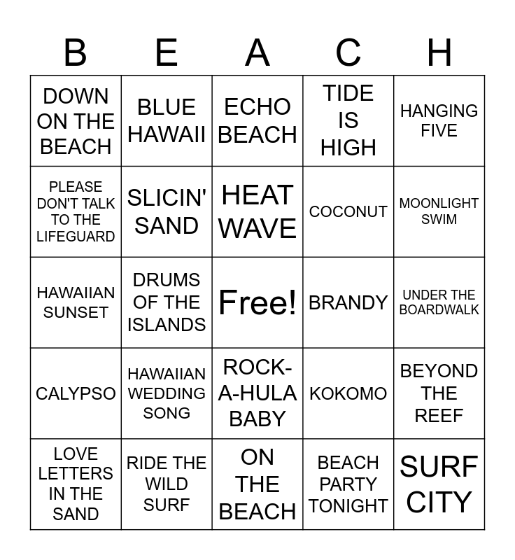 This bingo card has a free space and 66 words: ALL SUMMER LONG, BEACH BABY, BEACH BOYS BLUES, BEACH PARTY TONIGHT, BEYOND THE REEF, BEYOND THE SEA, BLUE HAWAII, BOYS OF SUMMER, BRANDY, CALIFORNIA GIRLS, CALYPSO, CASTLES IN THE SAND, CATCH A WAVE, COCONUT, COOL CHANGE, DOWN ON THE BEACH, DRUMS OF THE ISLANDS, ECHO BEACH, GIRLS ON THE BEACH, HANGING FIVE, HAWAIIAN SUNSET, HAWAIIAN WEDDING SONG, HEAT WAVE, HE'S MY BLONDE HEADED WOMPIE STOMPIE REAL GONE SURFER BOY, I LIVE FOR THE SUN, INTO THE MYSTIC, ISLAND OF LOVE, ITSY BITSY TEENY WEENY YELLOW POLKA DOT BIKINI, KOKOMO, LET'S GO SURFIN, LOVE LETTERS IN THE SAND, MACK THE KNIFE, MARGARITAVILLE, MOONDANCE, MOONLIGHT SWIM, OCTOPUS' GARDEN, ON THE BEACH, ON THE BEACH, ORINOCCO FLOW, PINA COLADA (ESCAPE), PLEASE DON'T TALK TO THE LIFEGUARD, RIDE THE WILD SURF, ROCK-A-HULA BABY, SAIL, SAIL ON, SAILOR, SEA OF LOVE, SLICIN' SAND, SUMMER HOLIDAY, SUMMER NIGHTS, SURF CITY, SURFER GIRL, SURFER JOE, SURFIN' BIRD, SURFIN CRAZE, SURFIN SAFARI, SURFIN USA, TELL EM I'M SURFIN, THE GIRL FROM IPANEMA, TIDE IS HIGH, UNDER THE BOARDWALK, UNDER THE SEA, V.A.C.A.T.I.O.N., WATERMELON MAN, WIPE OUT, WONDERFUL SUMMER and YELLOW SUBMARINE.